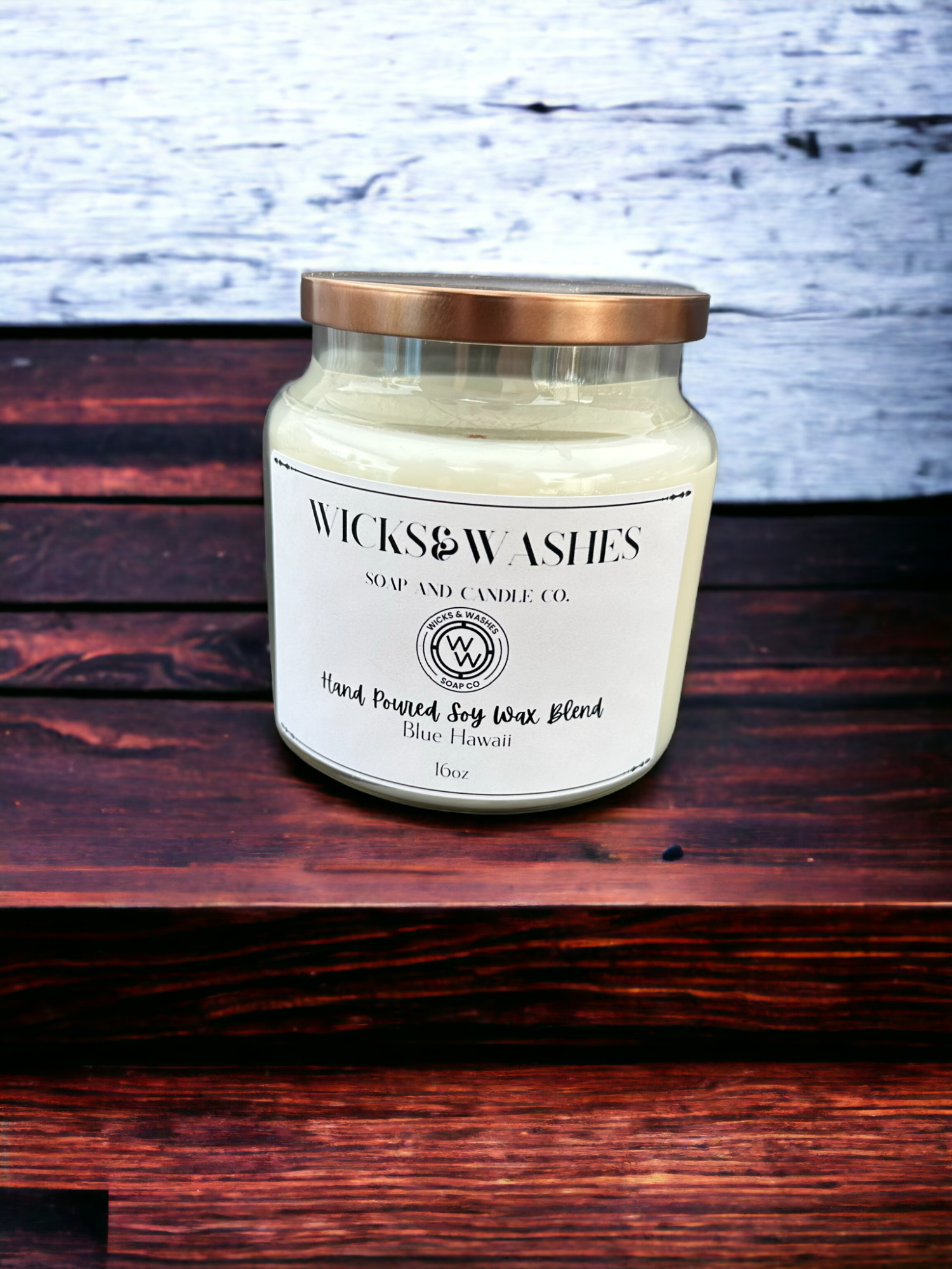 Hand Poured Soy Wax Blend, with a crackling wood wick 16oz
